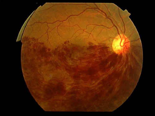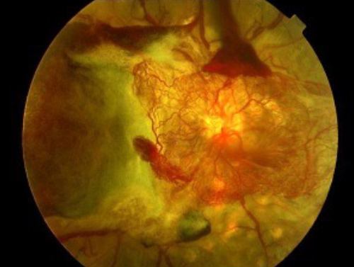 増殖糖尿病網膜症:多数の新生血管が視神経乳頭から伸びている