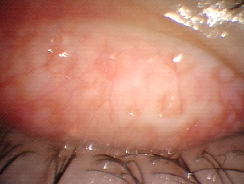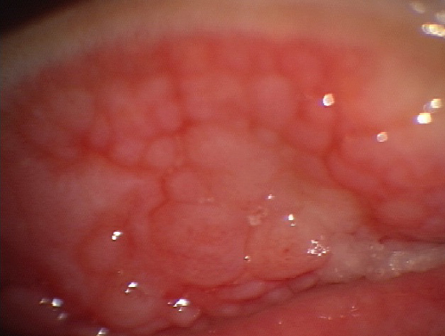上まぶたの裏に巨大乳頭という大きな出っ張りがたくさん形成されます。