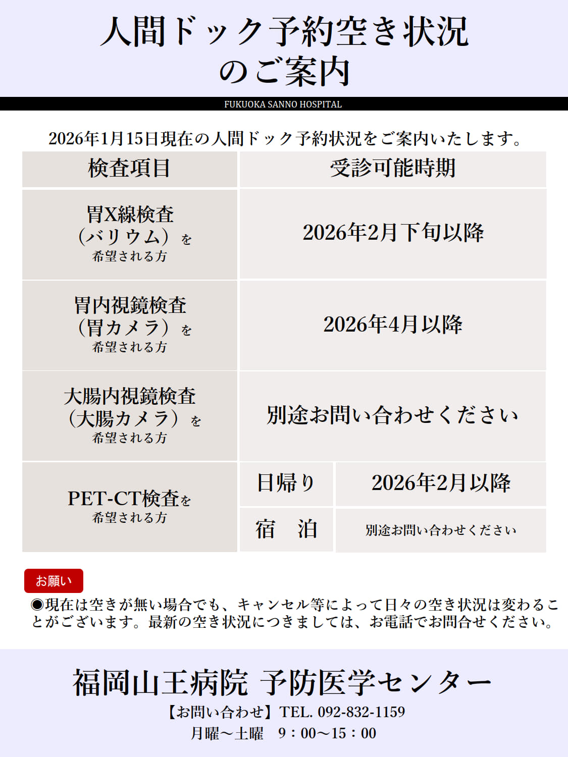 人間ドック予約状況のご案内(2026年1月15日現在)