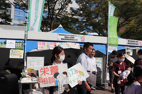 初日は福岡山王病院の看護師、助産師による「妊婦体験」や、保健師による血圧測定などの「健康相談」、栄養士による「栄養相談」のほか、リハビリスタッフが「ロコモチェック」を行いました。また、来年1月に新棟がオープンするグループの福岡中央病院(福岡市中央区薬院)の人間ドックPRも行いました。