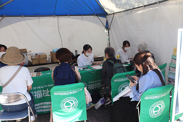 翌日は福岡国際医療福祉大学の4つの学科(理学療法、作業療法、視能訓練、言語聴覚の各学科)が「筋力チェック」「脳トレ」「嚥下機能チェック」「簡易視能検査」を行いました。また、谷明日香・本学特任准教授(ももたに歯科医院、歯科医師)が口腔健康チェックを実施しました。